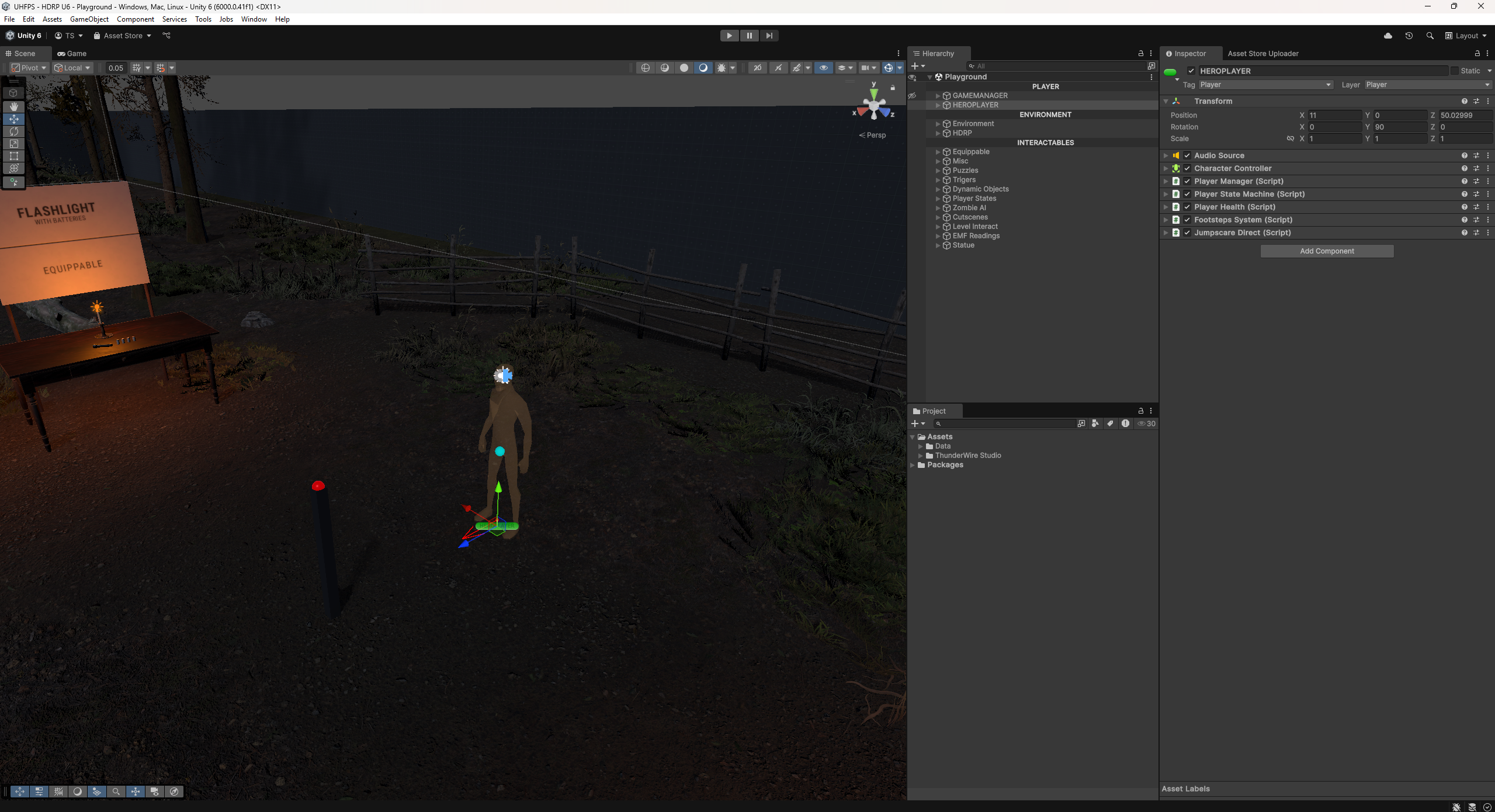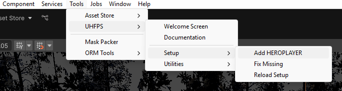 1. To get started, go to **Tools -> UHFPS -> Setup -> Add HEROPLAYER.** This will add the **GAMEMANAGER** and **HEROPLAYER** objects to the scene.