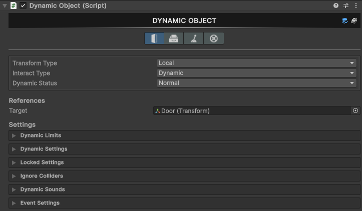The **Target** field refers to the object where all interactions will be applied. This can either be the current object where the **Dynamic Object** component is added or a parent object.