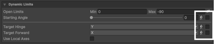 2. **Open Limits** is actually an angle how the door should open. Rotate the door to its open position, note the hinge value, and update the **Open Limits -> Max** limit accordingly.