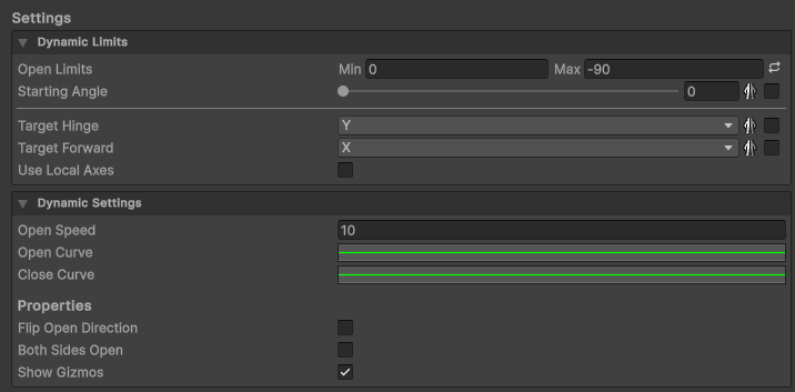 1. To configure a dynamic door, begin by setting the Open Limits, Hinge, and Forward Axis.
