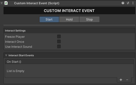 2. Next, to specify the desired actions upon interacting with the object, attach a **Custom Interact Event** component to the object and configure events for when you **Start**, **Hold**, or **Stop** interacting with it.
