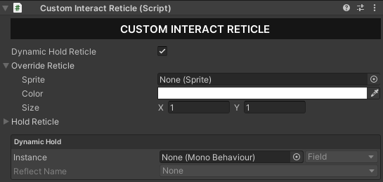 You can override the interact reticle while holding the use button by enabling **Dynamic Hold Reticle** and defining the reflection variable that will determine when to switch to the hold reticle.