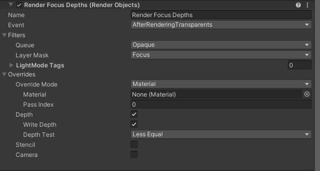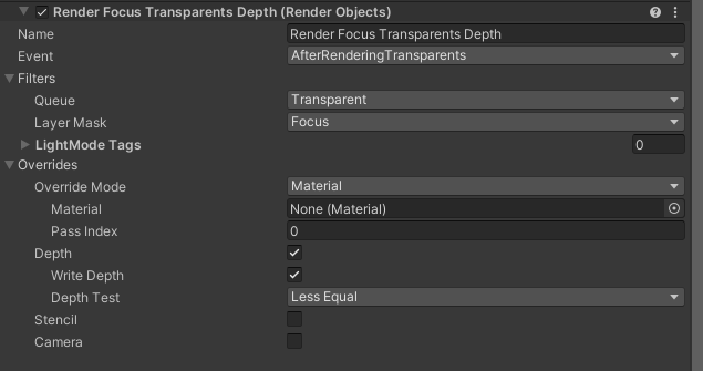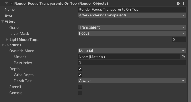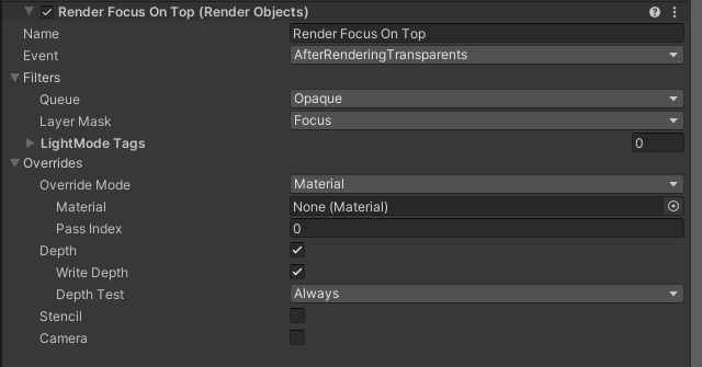 As the name suggests, this render feature is used to render the **Focus** layer transparents on top of everything else, even when the game view is blurred. It is important to call this render feature after the blur is applied, which would be **After Rendering Transparents**.