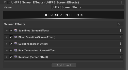 As the name indicates, the **UHFPS Screen Effects** feature is used to manage the basic screen effects of the kit that are displayed in certain situations. The main function of these effects is to perform full-screen blit allowing custom material to be displayed on screen. The basic effects of the kit are **Scanlines**, **Blood Disortion**, **Eye Blink**, **Fear Tentacles** or **Raindrop**.