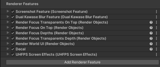 The **UHFPS Screen Effects** doesn't serve a new functionality to the URP, it's just a holder that gives a better overview of the kit effects that can be performed. Instead of having multiple **ScriptableObjects** added to the URP asset, it holds screen effects as classes.