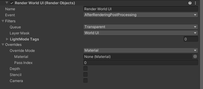 This render feature allows you to render the **World UI** and eliminates the problem where, when using the bloom effect, the elements on the world space canvas is somehow defined as a very shiny area, causing the elements to be unreadable.