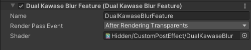 This renderer feature is used to blur the game view when you open the Inventory or Pause the game. It uses an image blurring technique that reduces the image size and blurs it. This technique is highly efficient. It's essential to call it **After Rendering Transparents** or **Before Rendering Post Processing**. This is because the transparent materials may not be blurred if it is utilized, for instance, **After Rendering Opaques**.
