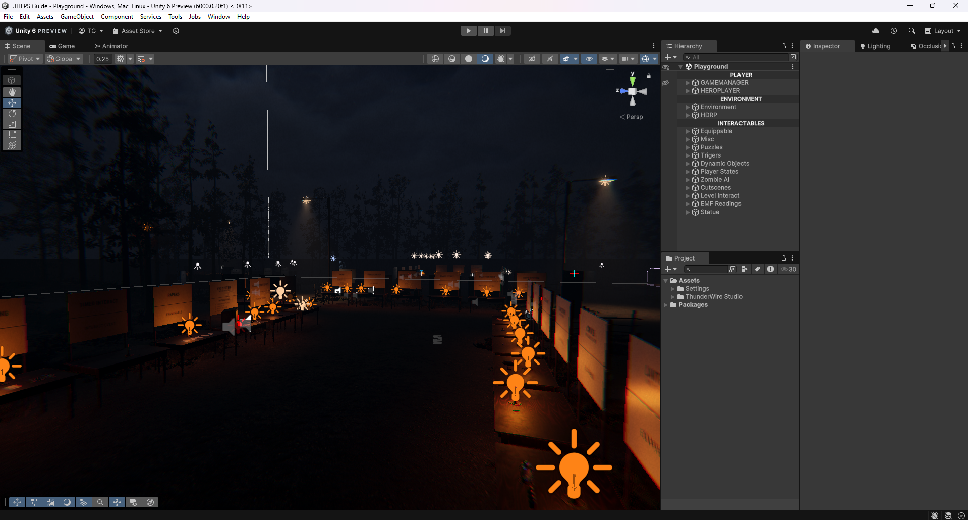 Demo scenes of the asset can be found in the ThunderWire Studio\UHFPS\_Demo\Scenes folder. The main scene, which shows everything from the asset, can be found in the Playground scene.