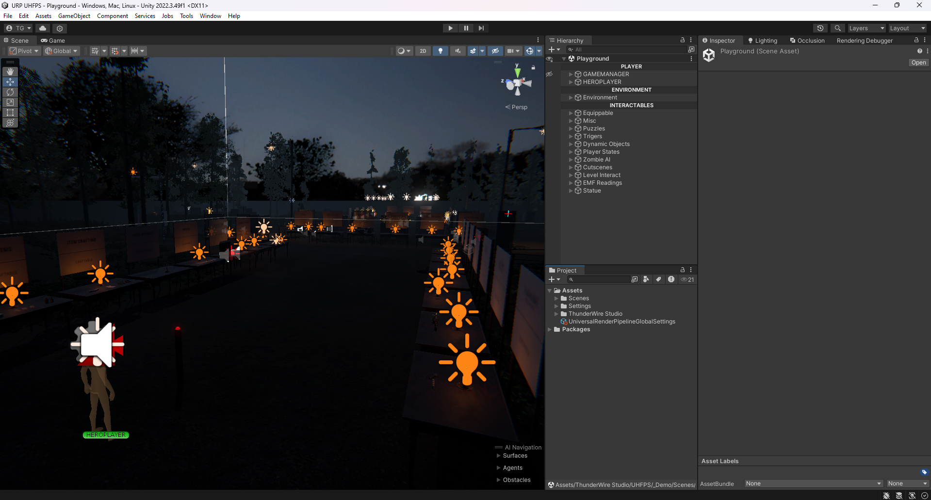 Demo scenes of the asset can be found in the **ThunderWire Studio\UHFPS\\\_Demo\Scenes** folder. The main scene, which shows everything from the asset, can be found in the **Playground** scene.