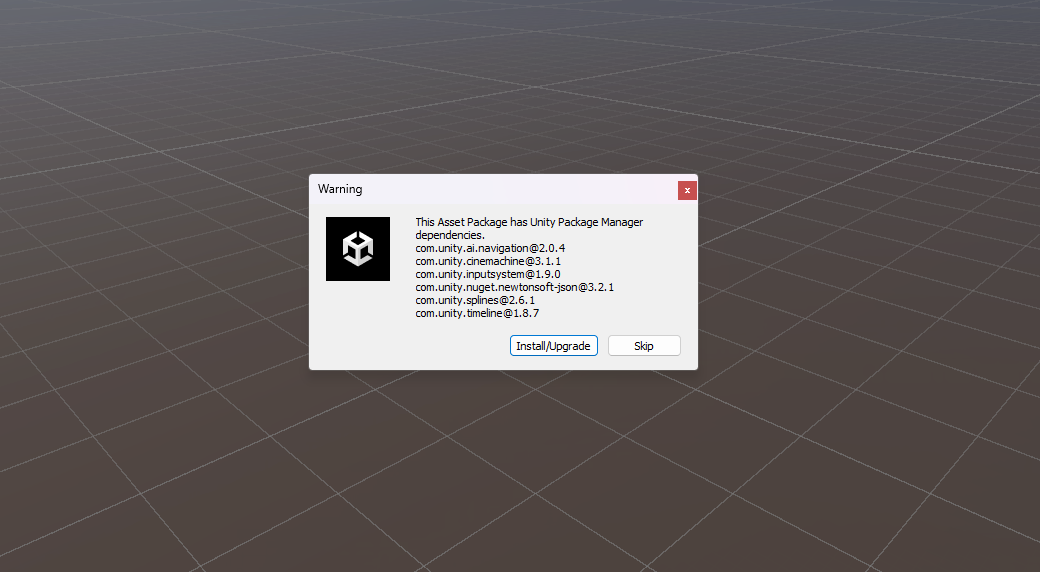 4. If you get a message saying that the **Asset Package has Unity Package Manager dependencies**, click **Install/Upgrade.** It will install all the required packages that have been used in the asset.