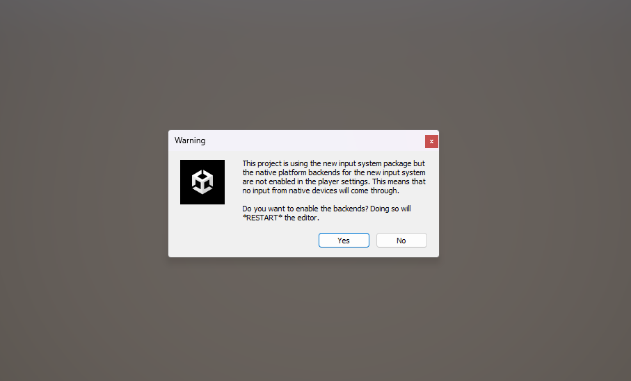 5. If you get a message saying that the project is using a new input system package and if you want to enable backends, click **No**. Unity will restart before importing the asset, which means you will have to import the asset again. We will restart Unity after the UHFPS has been imported.