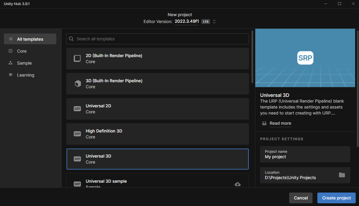 2. Create a new **Universal 3D** (URP) project with **Editor Version 6000.3.x or newer.**