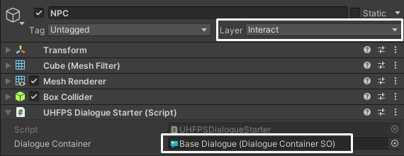 4. In your NPC, set the layer to **Interact**, which will allow you to interact with the NPC. Additionally, add the **UHFPSDialogueStarter** component to it.