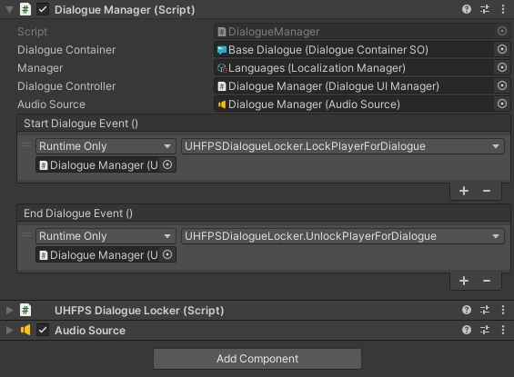 3. Add **UHFPSDialogueLocker** to the **Meet and Talk -> Dialogue Manager** prefab and set the **Dialogue Manager** dialogue events to **LockPlayerForDialogue()** and **UnlockPlayerForDialogue()**.